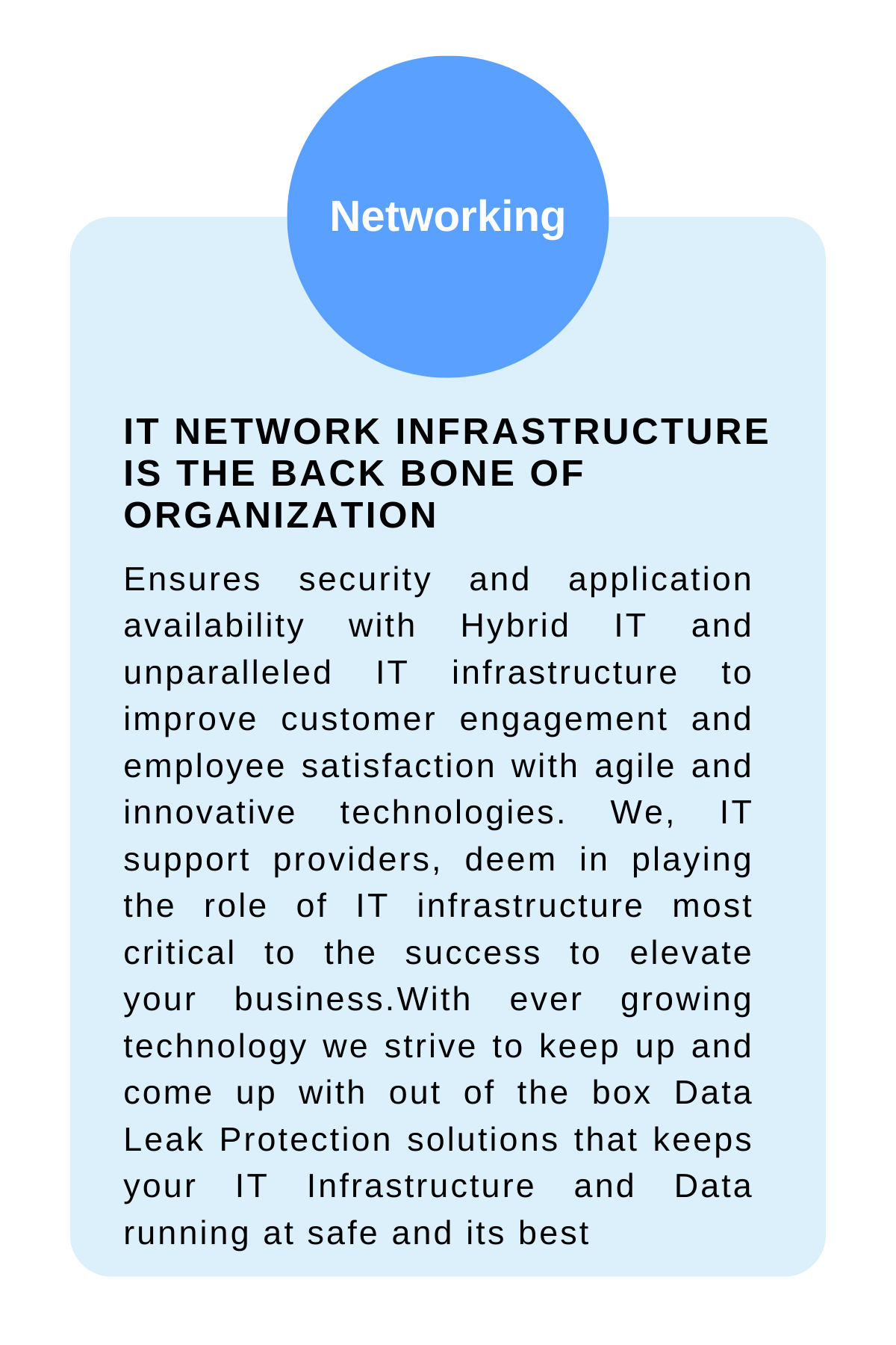 We assist companies to boost profit and growth with dedicated IT-enabled operations and IT-solutions. Our expert team will help your business to come across all the risks that you may face day to day. Our IT experts will analyse the requirements of your business environment to adopt the best IT infrastructure solution for your enterprise. Our infrastructure services include structured cabling, data centres, network solutions, hardware set up etc.
